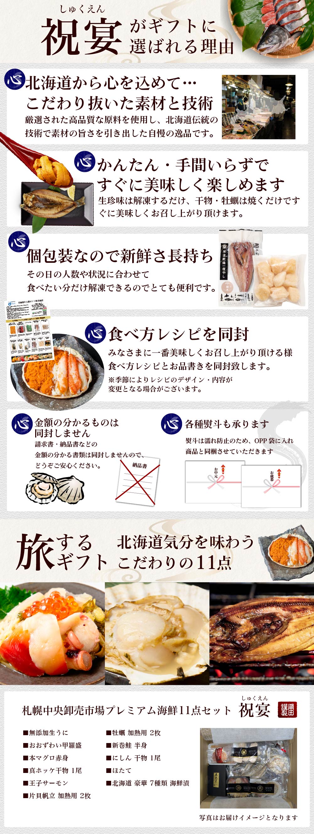| 商品説明 | 札幌中央卸売市場の海の幸を「祝宴」をあげたくなるほどふんだんに詰め合わせました。 この豪華な海鮮ギフトセットを大切な方々へお贈り致します。 贈り物~プレゼント・内祝い・誕生日・母の日・父の日・お中元・お歳暮・お年賀~に最適なセットになっております。 もちろん、ご自宅用で美味しい海鮮をお召し上がり頂くのにもオススメです。北海道札幌卸売市場の豪華海鮮を是非ご賞味ください。 |