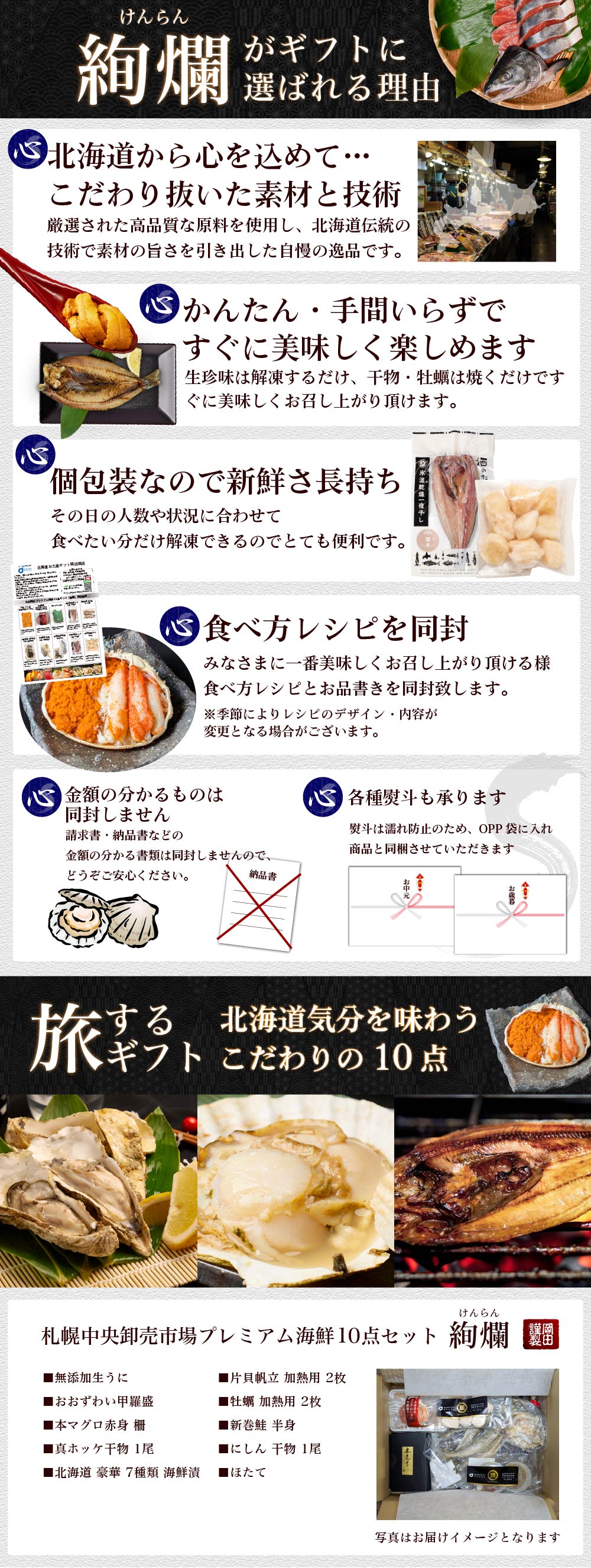 | 商品説明 | 札幌中央卸売市場の海の幸をふんだんに詰め合わせました。 この豪華「絢爛」な海鮮ギフトを大切な方々へお贈り致します。 贈り物~プレゼント・内祝い・誕生日・母の日・父の日・お中元・お歳暮・お年賀~に最適なセットになっております。 もちろん、ご自宅用で美味しい海鮮をお召し上がり頂くのにもオススメです。北海道札幌卸売市場の豪華海鮮を是非ご賞味ください。 |