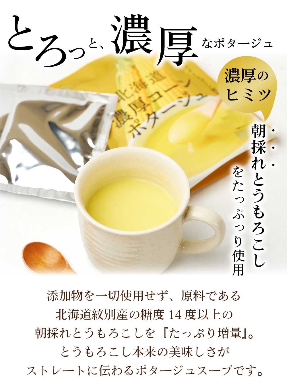 | 商品説明 | 添加物を一切使用せず、原料である北海道紋別産の糖度14度以上の朝採れとうもろこしを『たっぷり増量』。 とうもろこし本来の美味しさがストレートに伝わるポタージュスープです。 |