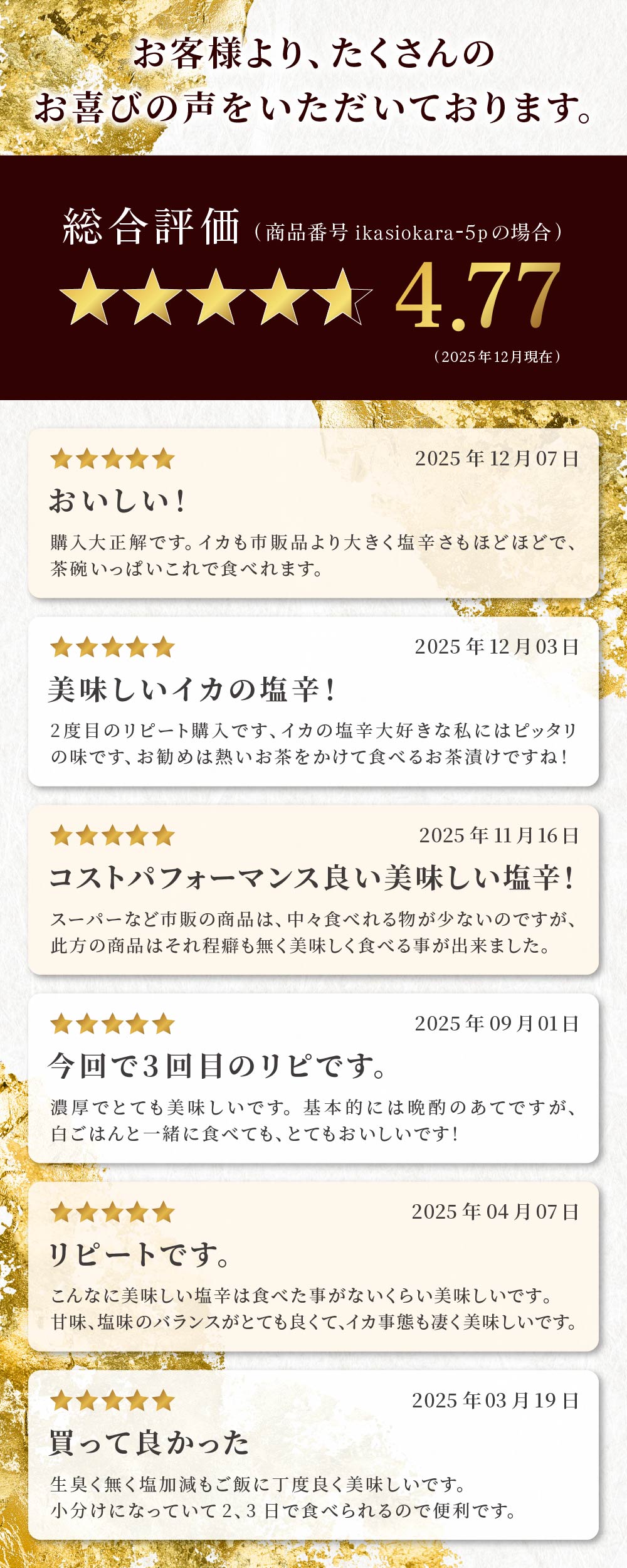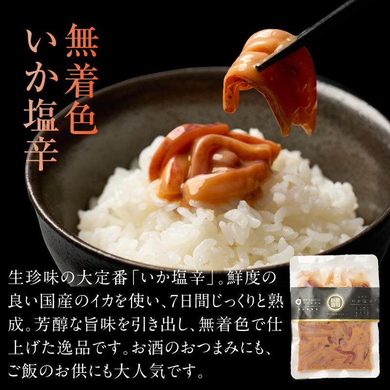 | 商品説明 | 生珍味の大定番「いか塩辛」。鮮度の良い国産のイカを使い、7日間じっくりと熟成。芳醇な旨味を引き出し、無着色で仕上げた逸品です。お酒のおつまみにも、ご飯のお供にも大人気です。 |