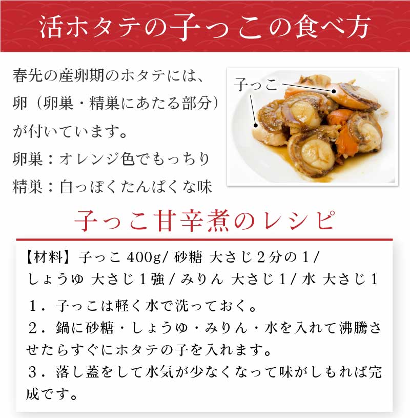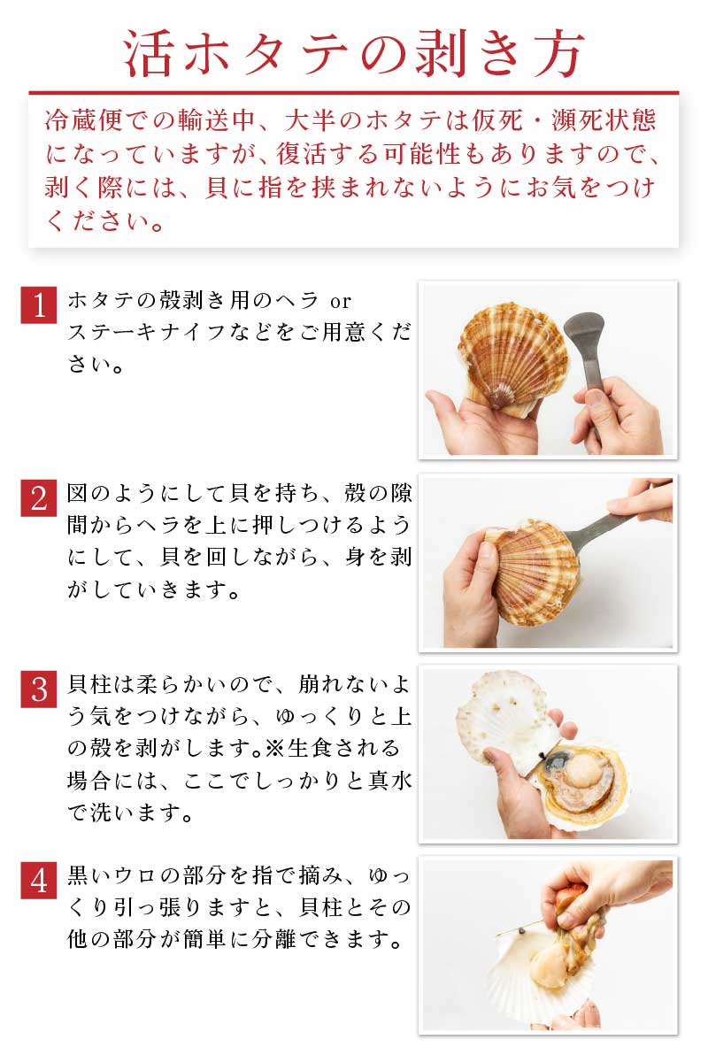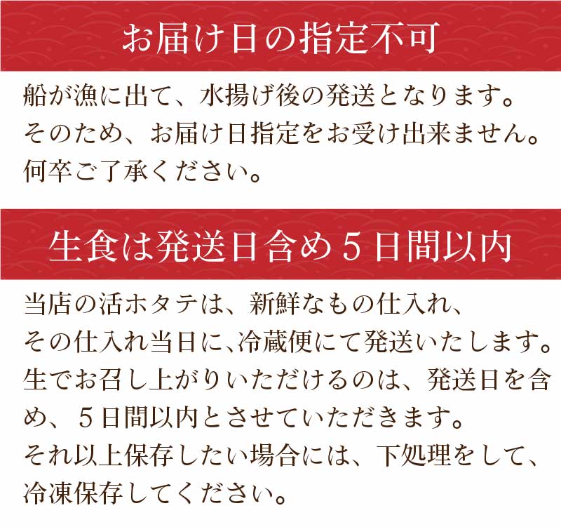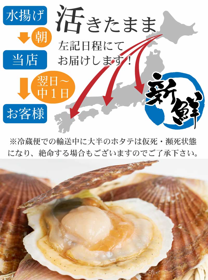 | 商品説明 | ホタテの聖地・北海道から、とっておきの「活ホタテ」を活きたままお届け! お送りするホタテは、水揚げ後から発送日当日の朝まで水槽でパクパク元気いっぱいの北海道産天然ホタテ! たっぷり2kgでのお届けです。 【ご注意1】発送は漁での水揚げ次第となりますため、お届け日のご指定を承れません。 【ご注意2】生食は発送日を含め、5日間以内となります。それ以上保存する際には、下処理をして、冷凍保存してください。 【ご注意3】ウロは生でも加熱しても食べれません。かならず取り除いてからお召し上がりください。 【ご注意4】天然物の殻付きホタテにつき、殻の縁が割れているものなどございます。何卒ご了承下さい。 【ご注意5】冷蔵便での輸送中に大半のホタテは仮死・瀕死状態になり、絶命する場合もございますのでご了承下さい。 |