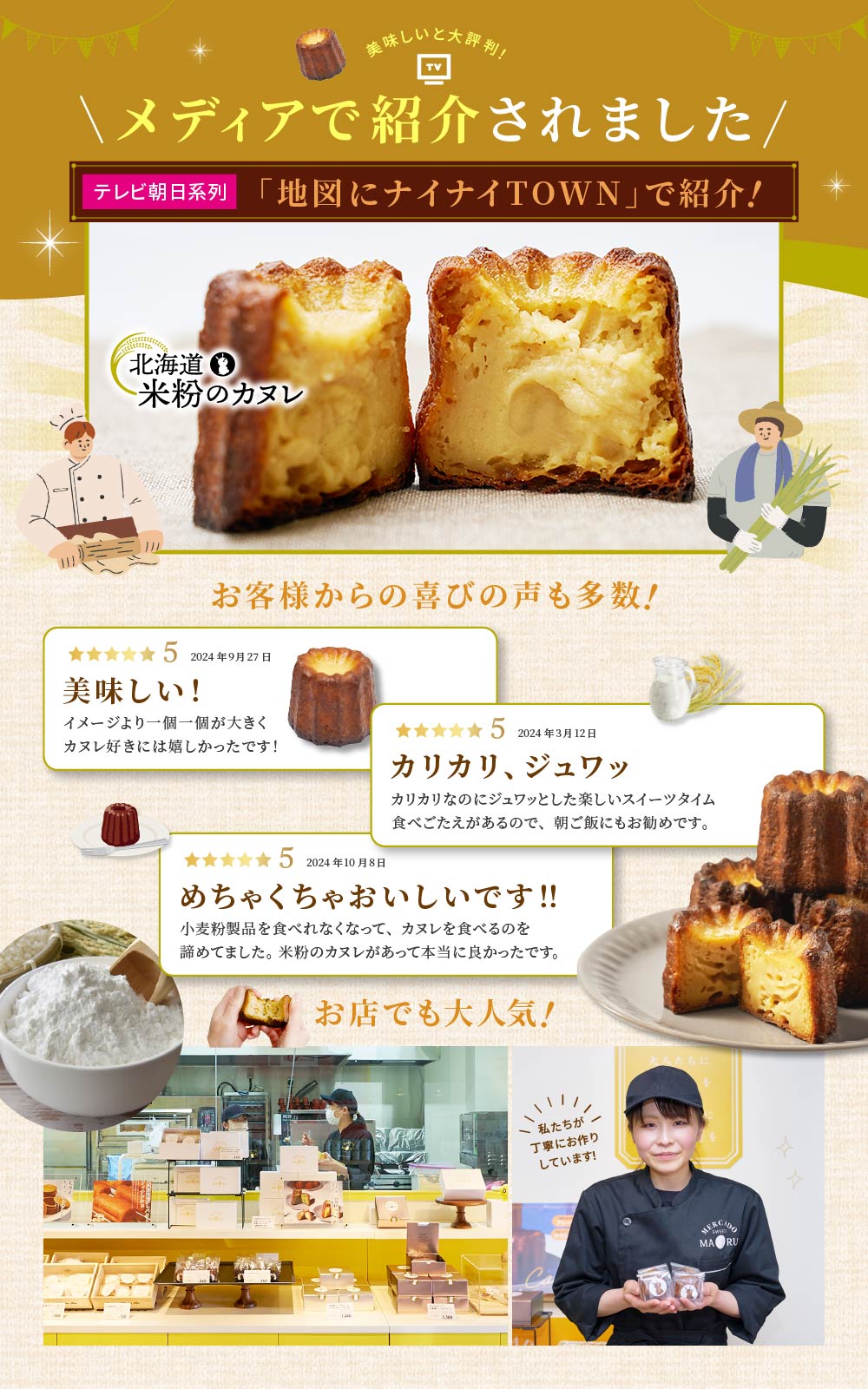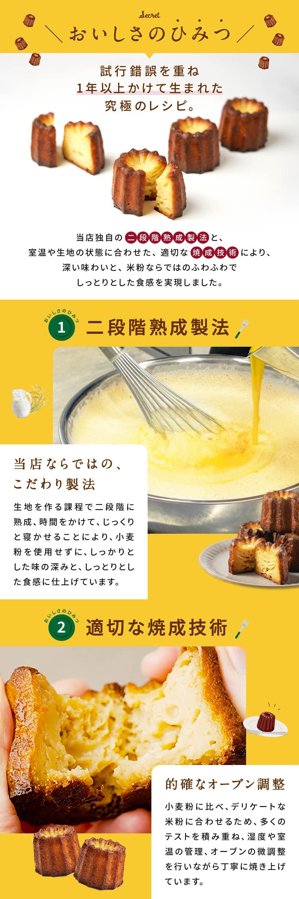 | 商品説明 | 北海道二段階熟成カヌレに『米粉のカヌレ』が登場! 小麦粉を使わないグルテンフリー食品ながら『米粉のカヌレ』は「二段階熟成技術」により、カヌレ本来のおいしさを実現しています。 小麦アレルギーのお子様も安心しておいしく食べられる新しいスイーツです。 小麦粉不使用・ラム酒不使用、保存料等の添加物等も使用しておりません。 甘味には「てんさい糖」を使用して、やさしい甘みに仕上げました。 パティシエがこだわり抜いた『米粉のカヌレ』、是非一度お試しください。 |