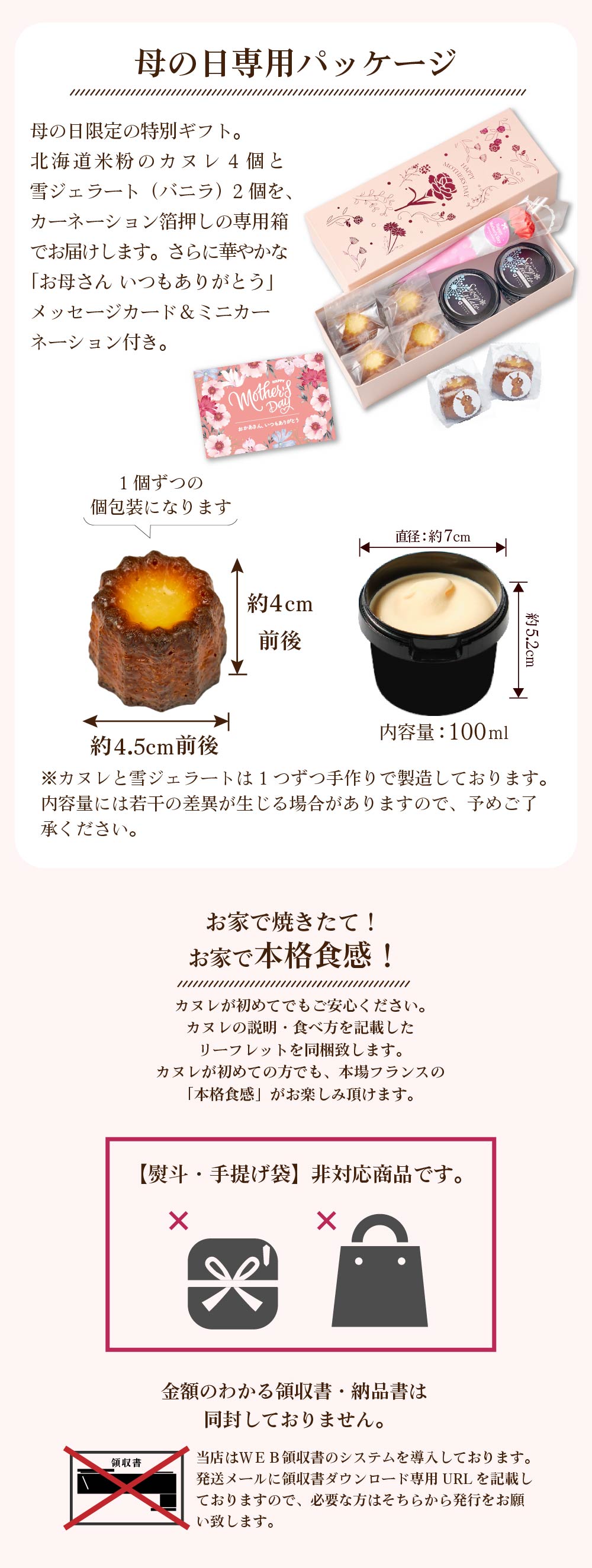 | 商品説明 | 北海道・札幌中央卸売市場のスイーツ店「メルカードスイーツまる」より、お母さんが笑顔になる母の日限定ギフト。 【北海道 米粉のカヌレ】 グルテンフリーながら二段階熟成で、外はカリッと中はしっとり。本格的な味わいに仕上げました。小麦粉・ラム酒・保存料不使用、てんさい糖のやさしい甘みが特長です。 【雪ジェラート バニラ】 北海道産ミルクを使用した濃厚でクリーミーな味わい。ひとつひとつ手作りで仕上げています。 【母の日専用パッケージ】 華やかな専用箱でお届け。「お母さん いつもありがとう」メッセージカード&ミニ薔薇(造花)付き。初めての方にも安心のリーフレット同梱。 |