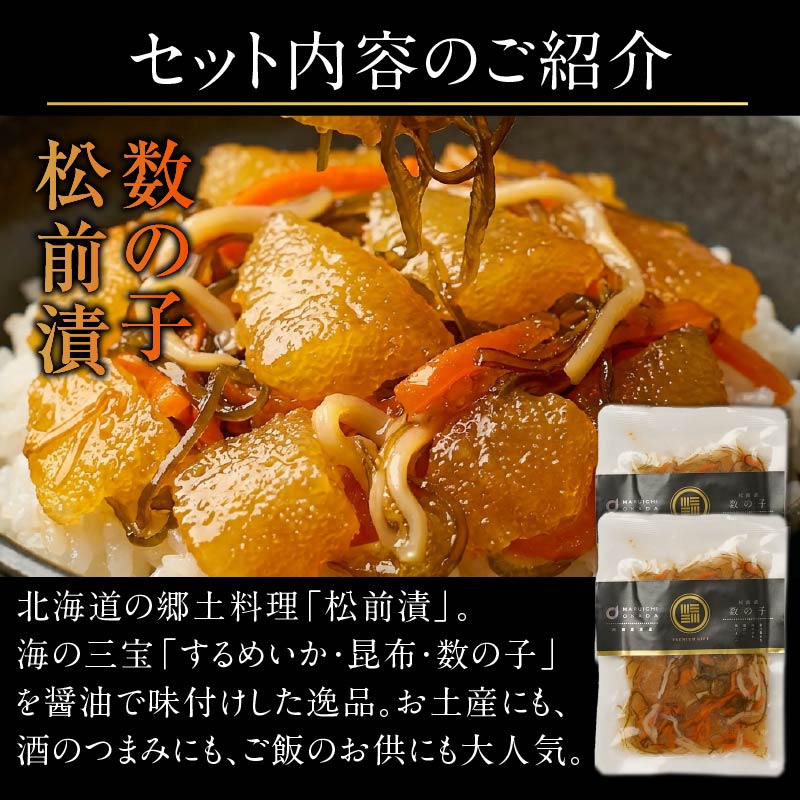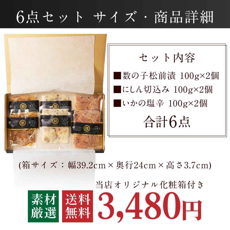 | 内容量 | 数の子松前漬 100g×2個、にしん切込み 100g×2個、いかの塩辛 100g×2個、合計6パックセット |
