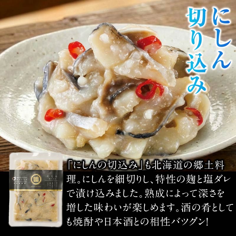 | 商品説明 | 「にしんの切込み」も北海道の郷土料理。にしんを細切りし、特性の麹と塩ダレで漬け込みました。熟成によって深さを増した味わいが楽しめます。酒の肴としても焼酎や日本酒との相性バツグン! |