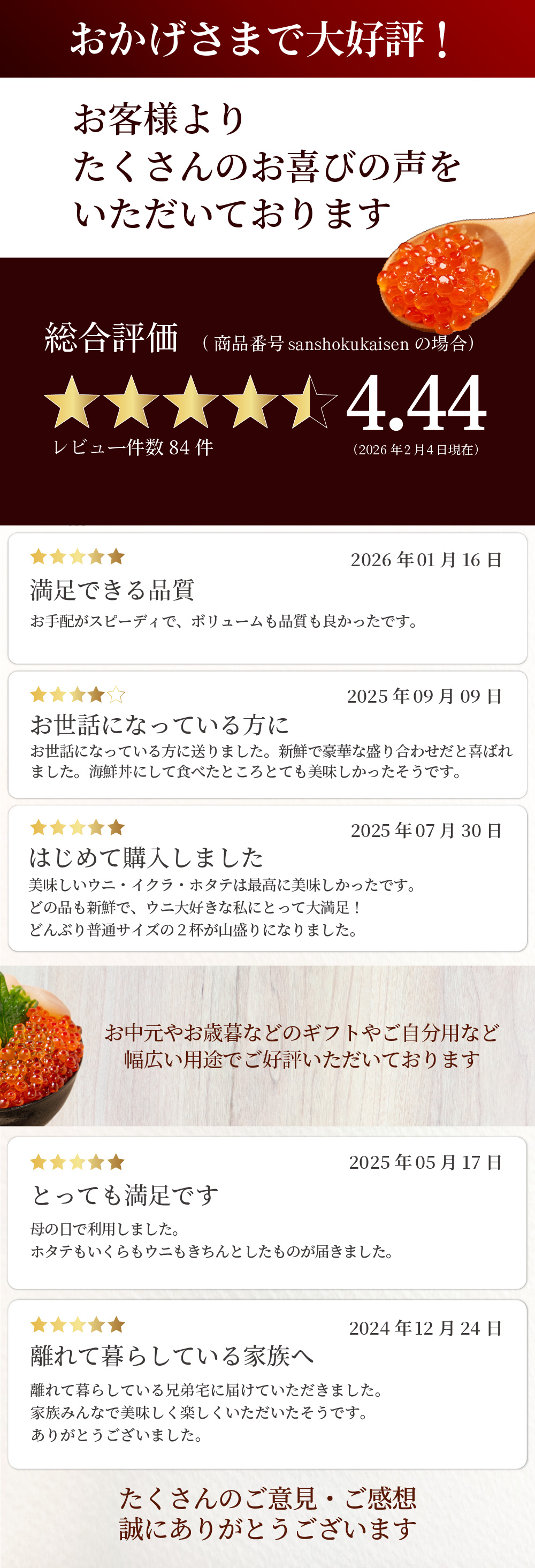 | 内容量 | (1)【ねぎとろ+いくら2色丼】 ・ねぎとろ(北海道加工) 150g ・いくら醤油漬(鱒)(アメリカまたはロシア産) 1個 (2)【ほたて+いくら2色丼】 ・生ほたて(北海道産)100g ・いくら醤油漬(鱒)(アメリカまたはロシア産) 1個 ご注文時に(1)(2)からお選びください |