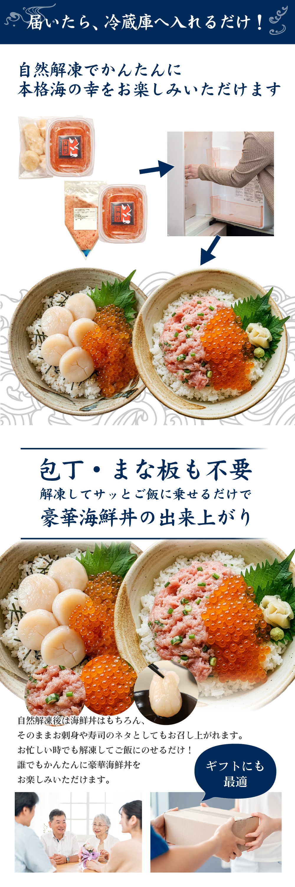 厳選いくらとホタテかねぎトロを2つ組み合わせた海鮮丼をご自宅で