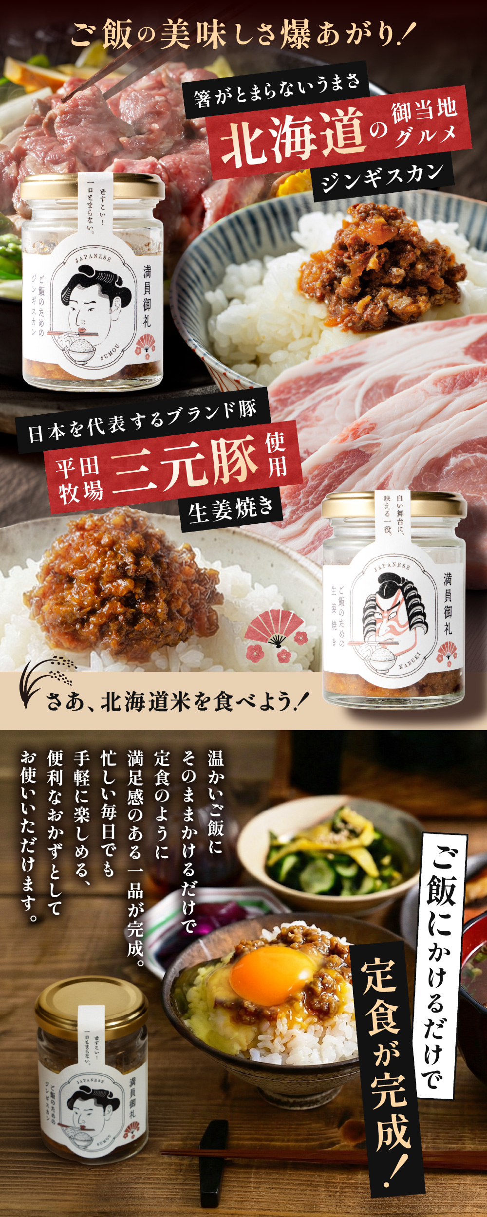 | 商品説明 | \岡田商店オリジナル/ 今回の「ご飯にかけるシリーズ」のデザインは、“ご飯”という日常的なキーワードを起点に、 日本の伝統美を表現することを意識しました。モチーフとして選んだのは、日本を代表する三大伝統芸能である相撲?歌舞伎?能。 たくさんのご飯(満員)に、たくさんかけてお召し上がりいただける、ジンギスカン・生姜焼きです。 薬味のかわりにご使用いただいてもGOODな商品です。 |