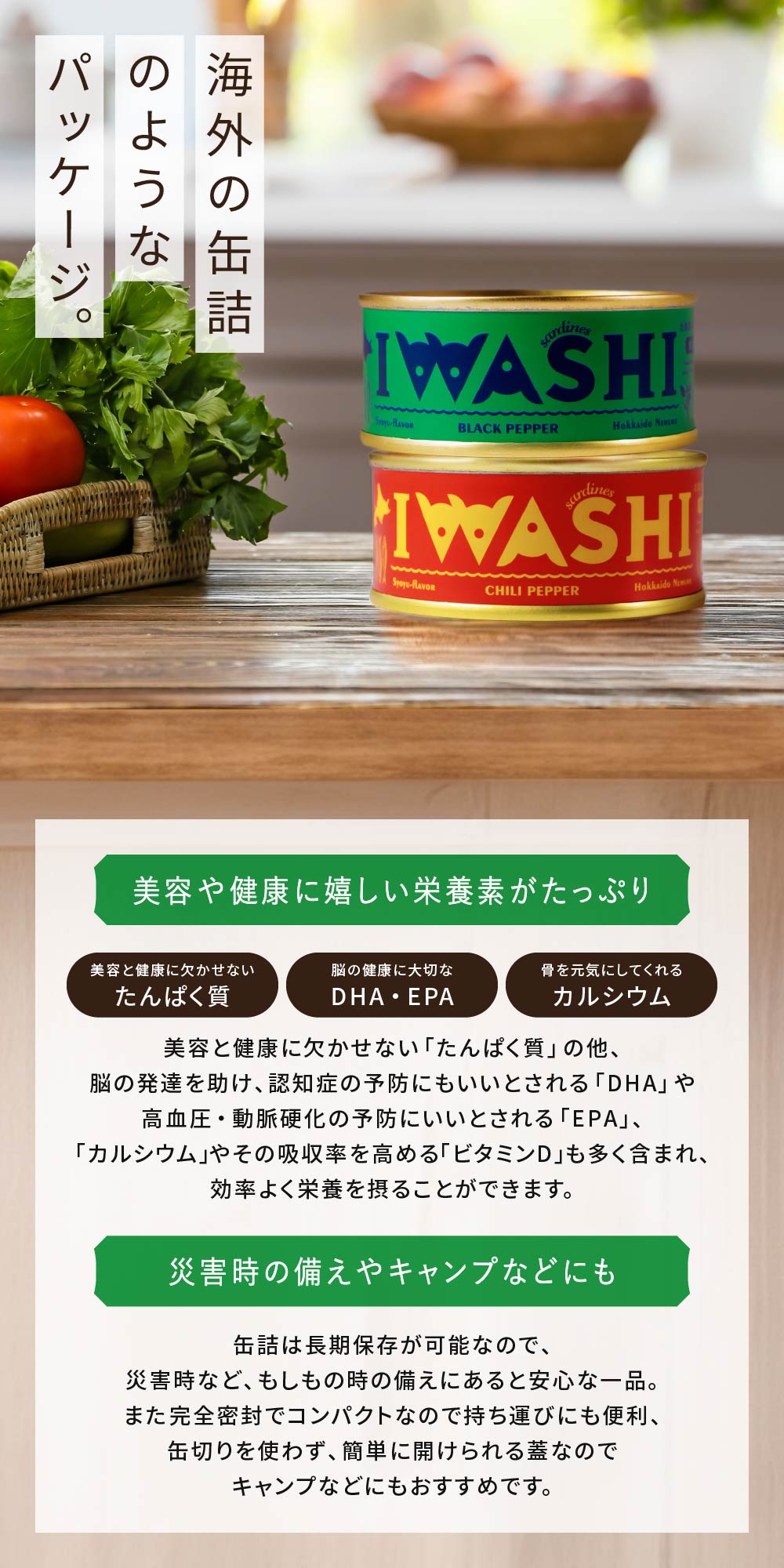 【缶詰】IWASHI-北海道いわし醤油漬 唐辛子入×3個 黒胡椒味×3個 保存食・長期保存・おつまみ 【パケ大】