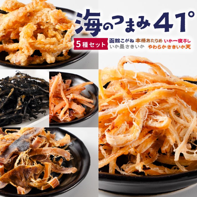 内容量 | ・海のつまみ41°函館こがね 33g×1個 ・海のつまみ41°函館 本格あたりめ 30g×1個 ・海のつまみ41°函館 いか墨さきいか30g×1個 ・海のつまみ41°函館 やわらかさきいか天 50g×1個 ・海のつまみ41°函館 いか一夜干し 38g×1個 |