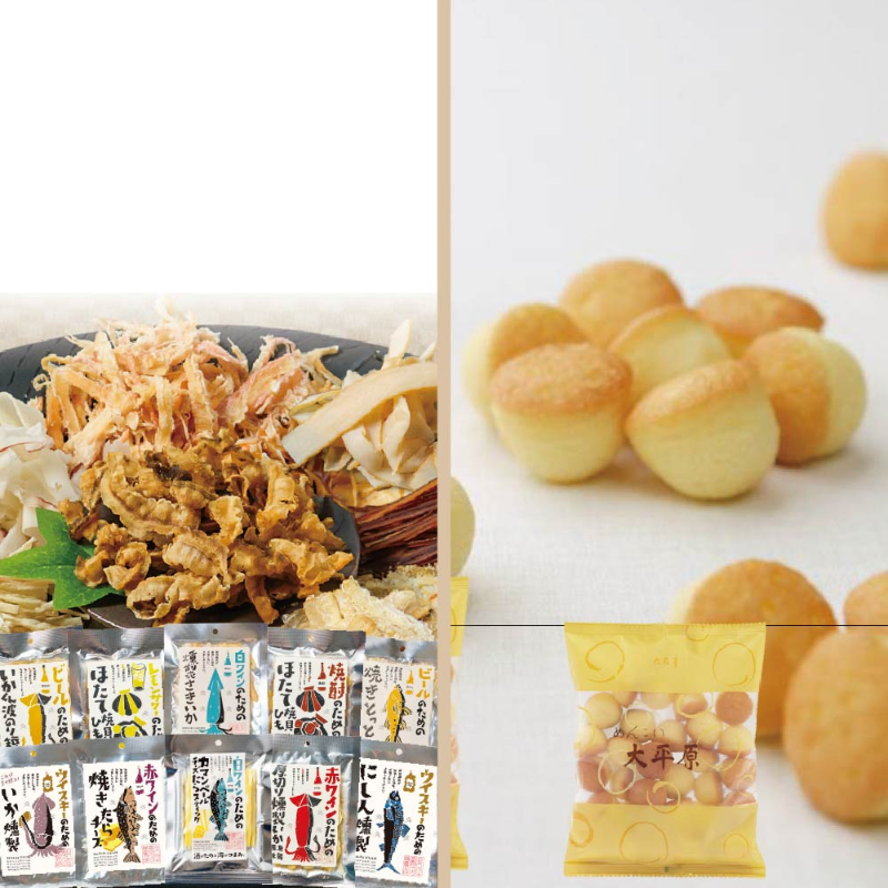 | 商品説明 | 六花亭の人気商品「めんこい大平原」と岡田商店オリジナル珍味を組み合わせた豪華セットです。 【六花亭めんこい大平原】 見た目も愛らしいひと口サイズのマドレーヌです。香り豊かなバターの風味をお楽しみください。 記念日にギフトにいつでもご利用頂ける、貰った方々も喜んでもらえるよう工夫を凝らした商品です。 【酒のための海のつまみシリーズ】 「美味しいお酒の肴に、極上の北海道の海の幸を」 丸市岡田商店が長年珍味を取り扱ってきた経験を生かし、お酒好きに絶対喜ばれる北海道珍味を厳選しました。 日本酒やビールはもとより、焼酎、白ワインにもピッタリの珍味をセレクトしました。 各単品の袋のデザインはとっても可愛らしく、ついつい手にとってしまうほど。 |