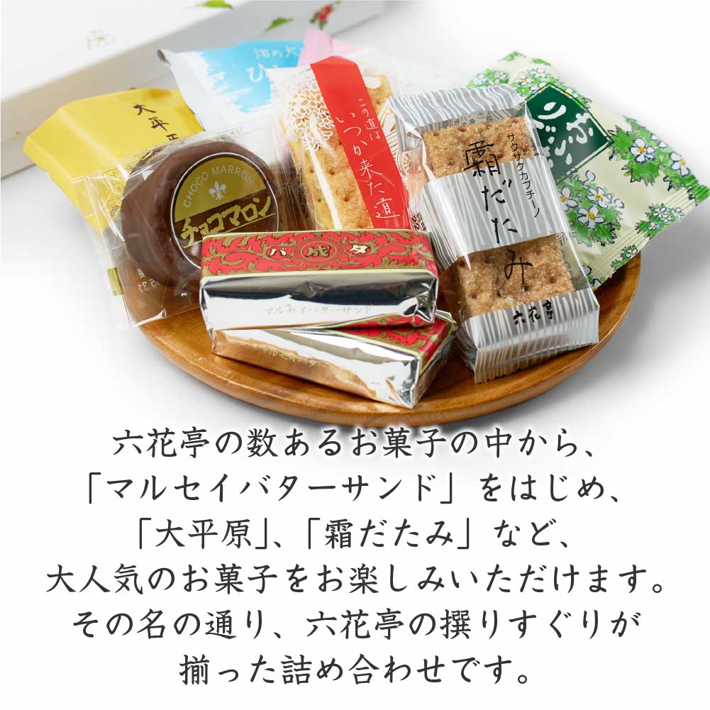 | 商品説明 | ありがとうの気持ちを北海道の銘菓セットにこめてお贈りしませんか? 六花亭の数あるお菓子の中から、「マルセイバターサンド」をはじめ、「大平原」、「霜だたみ」など、大人気のお菓子をお楽しみいただけます。 その名の通り、六花亭の撰りすぐりが揃った詰め合わせで、お土産や贈り物に最適な商品です。 |