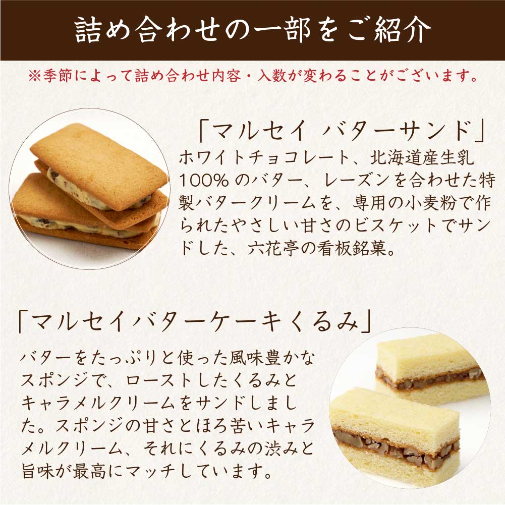 | 詰め合わせ内容 | 9個入×2箱セット セット内容 ・マルセイバターサンド ・百歳 ・霜だたみ ・マルセイバターケーキくるみ ・大平原 ・花の大地ひろびろ ・北加伊道 ・ホワイトチョコレート ・雪やこんこ など ※季節によって詰め合わせ内容・入数が変わることがございます。 |