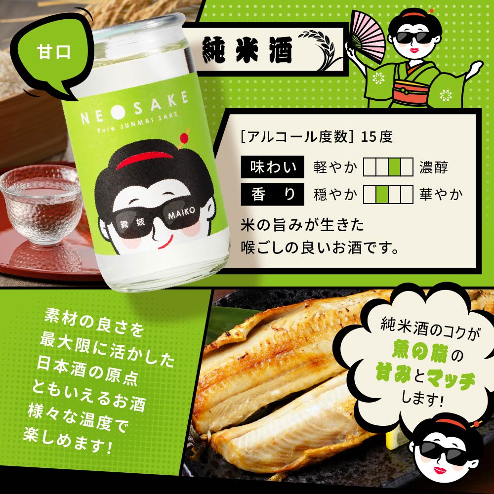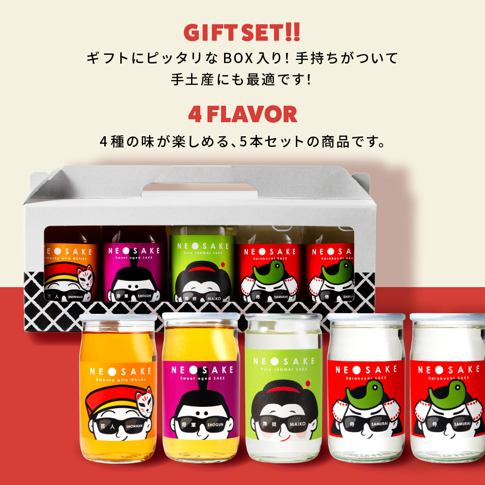 内容量 | ・NEO NIPPON SAKEUP-侍-辛口 180ml×2本 ・NEO NIPPON SAKEUP-将軍-貴醸酒 180ml×1本 ・NEO NIPPON SAKEUP-芸人-梅酒 180ml×1本 ・NEO NIPPON SAKEUP-舞妓-純米酒 180ml×1本 |