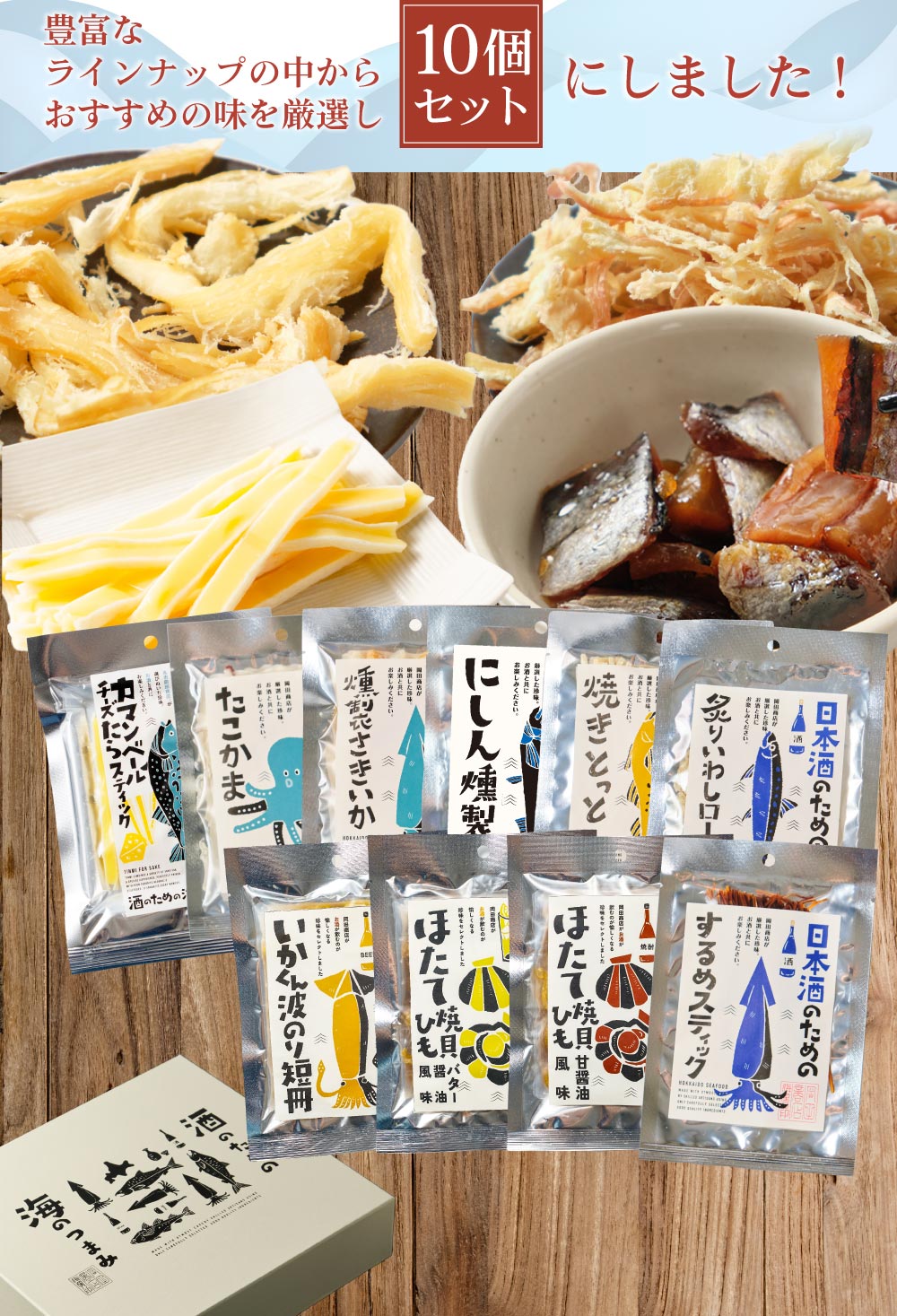 | 内容量 | 酒のための海のつまみ 10種類Aセット ・焼酎のためのほたて焼貝ひも甘醤油風味:31g ・ウイスキーのためのにしん燻製:28g ・ビールのためのいかくん波のり短冊:38g ・ビールのための焼きとっと:43g ・日本酒のための炙りいわしロール:31g ・日本酒のためのするめスティック:29g ・白ワインのための燻製さきいか:33g ・白ワインのためのたこかま:29g ・白ワインのためのカマンベールチーズたらスティック:40g ・レモンサワーのためのほたて焼貝ひもバター醤油風味 :31g |